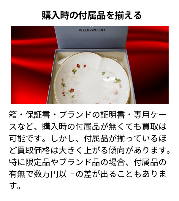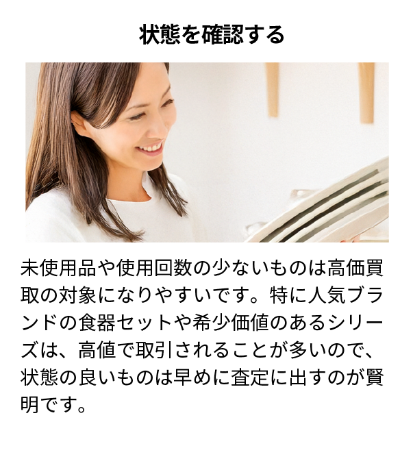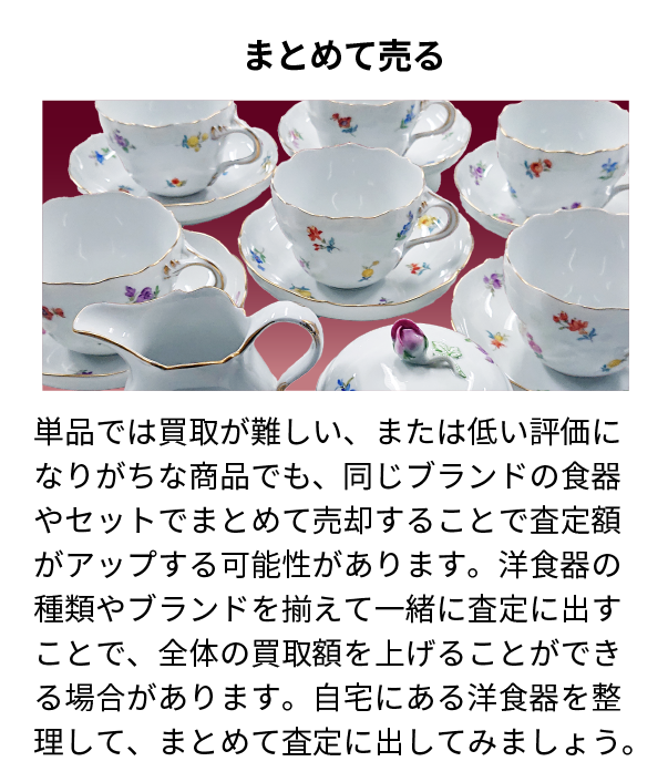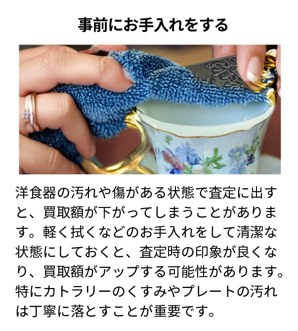 高価買取になりやすい洋食器は 付属品が揃っているほど買取価格は大きく上がる傾向があります。特に限定品やブランド品の場合、付属品の有無で数万円以上の差が出ることもあります。また軽く拭くなどのお手入れをして清潔な状態にしておくと、査定時の印象が良くなり、買取額がアップする可能性があります。人気ブランドの食器セットや希少価値のあるシリーズは、高値で取引されることが多いので、状態の良いものは早めに査定に出すのが賢明です。同じブランドの食器やセットでまとめて売却することで査定額がアップする可能性があります。洋食器の種類やブランドを揃えて一緒に査定に出すことで、全体の買取額を上げることができる場合があります。